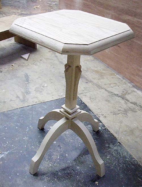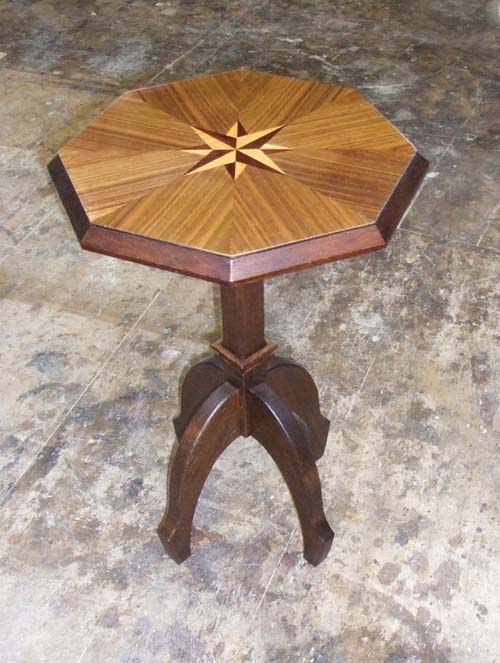 天板は正八角形。全面象嵌のため天板は合板となります。無垢の板に突板を前面に貼ってしまうと、湿度による木の伸縮のため薄い突板が裂けてしまうためです。
