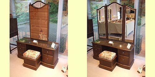 和服を着るために足元まで見えるような三面鏡をとの要望で、天板を低くし鏡を長くしました。足元が見えやすいように、天板の中央は狭く両袖は広くなっています。、